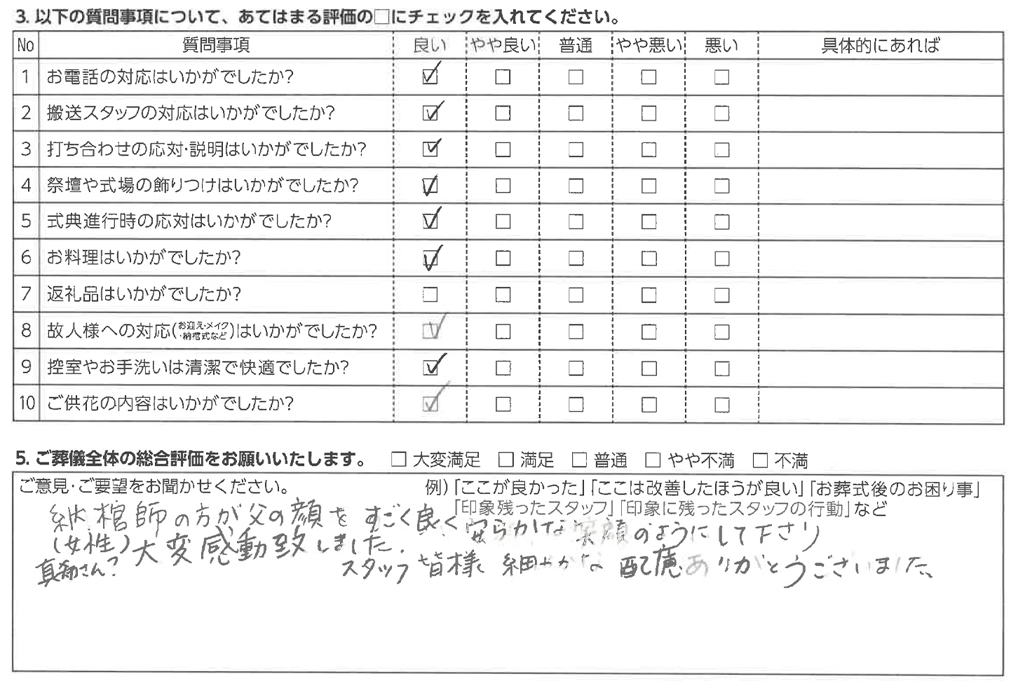納棺師の方が父の顔をすごく良く安らかな笑顔のようにして下さり、大変感動致しました。スタッフ皆様細かな配慮ありがとうございました。