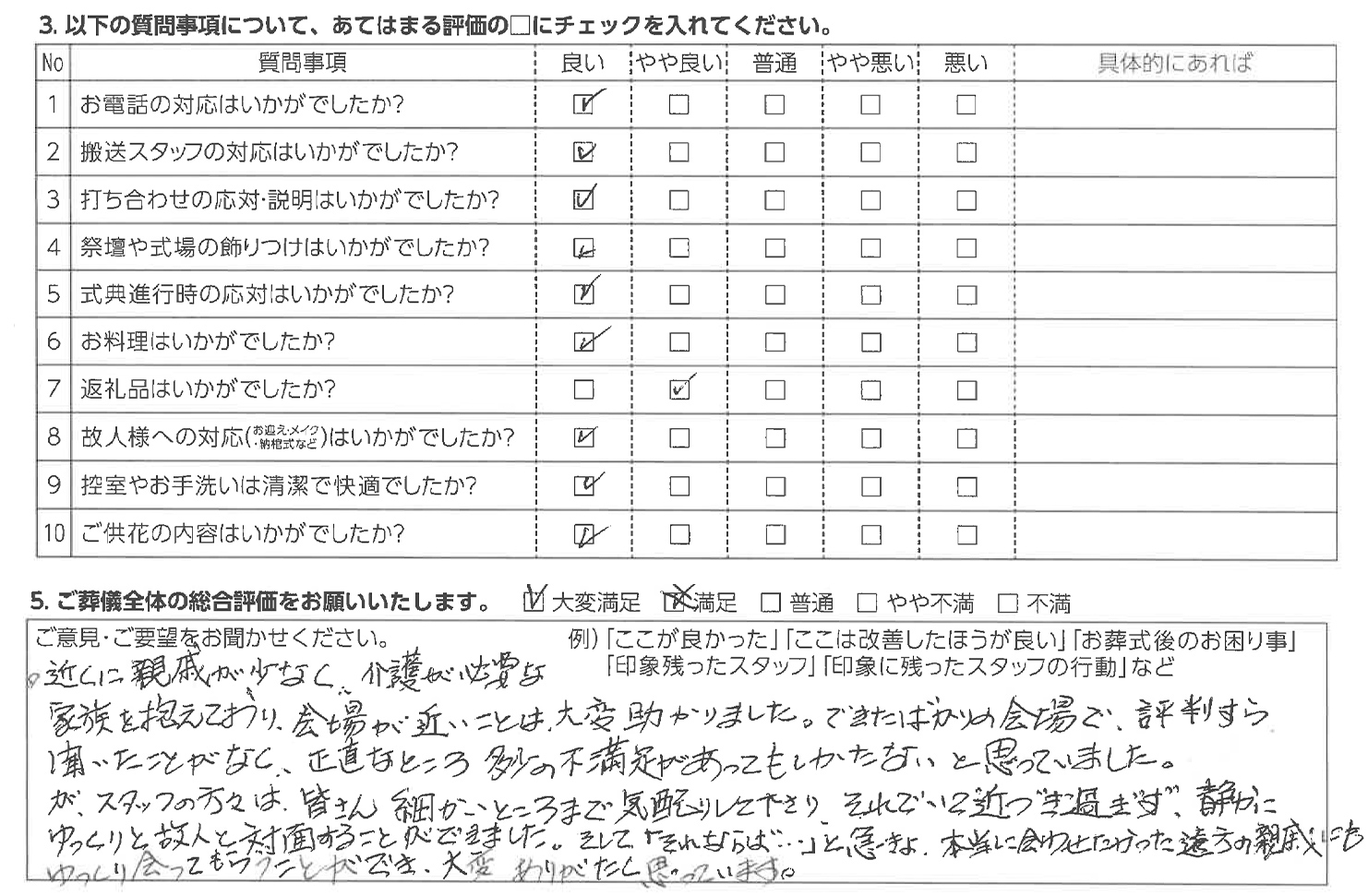 近くに親戚が少なく、介護が必要な家族を抱えており会場が近いことは大変助かりました。できたばかりの会場で評判すら聞いたことがなく、正直なところ多少の不満足があってもしかたないと思っていました。ですが、スタッフの方々は皆さん細かいところまで気配りして下さり、それでいて近づき過ぎず静かにゆっくりと故人と対面することができました。そして「それならば…」と急遽、本当に会わせたかった遠方の親戚にもゆっくり会ってもらうことができ、大変ありがたく思っています。